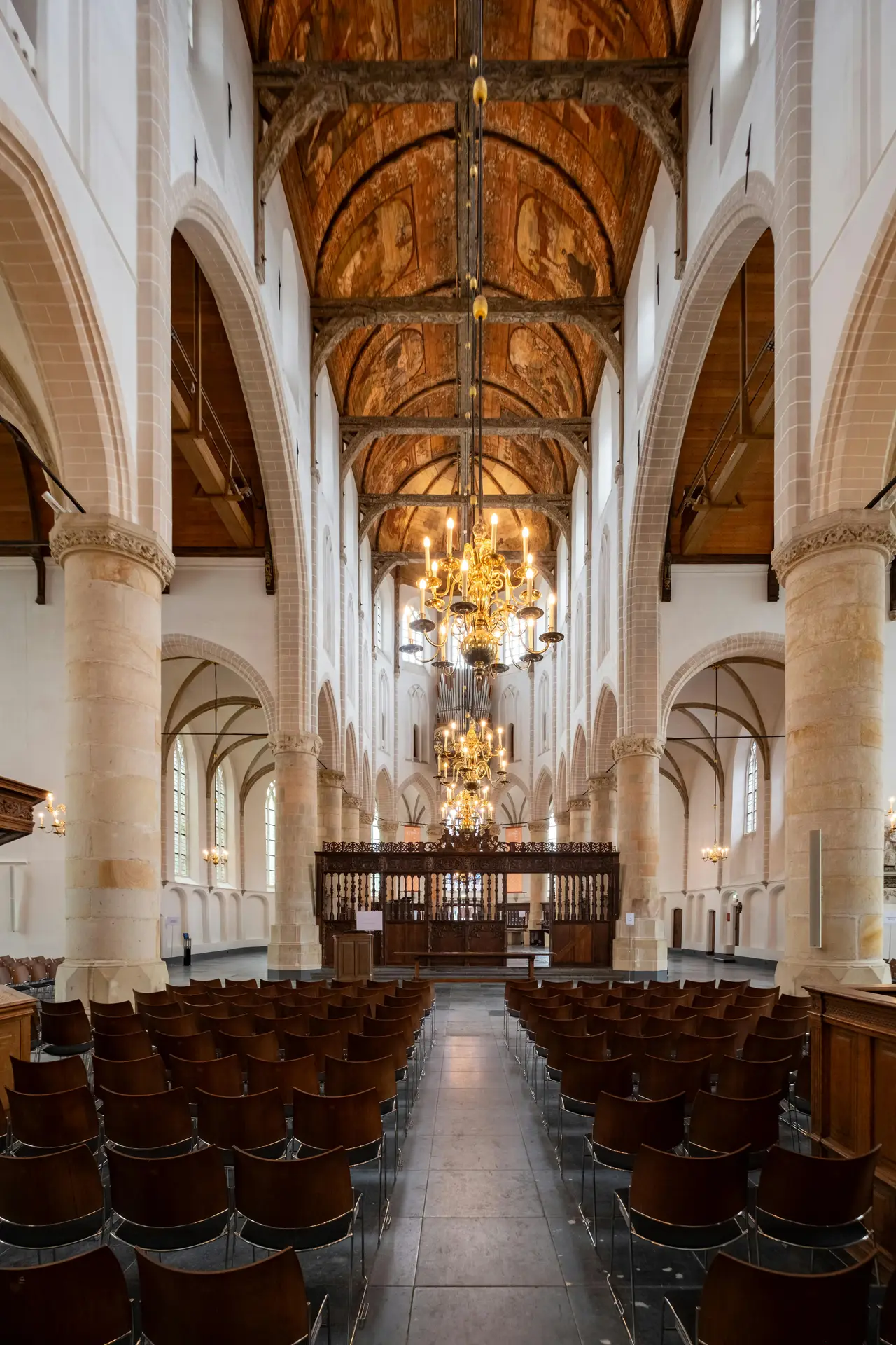 עיצוב פנים דרמטי עם תקרות גבוהות, עמודי עץ כהה, נברשות תקופתיות ועוגב עתיק שמלווה את התפילה.